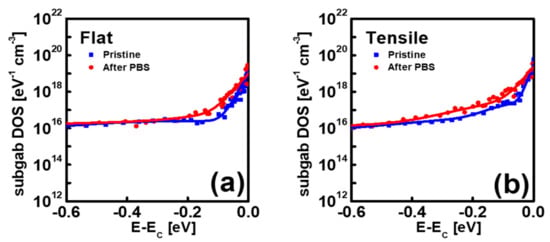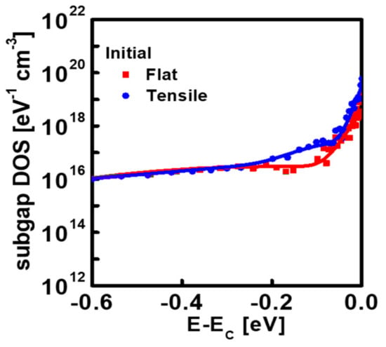 To find out the physical mechanism for the observed phenomenon in Figure 4, the subgap DOS were extracted from the IGZO TFTs before and after PBS application under mechanical-bending stress and no mechanical stress, respectively, using the monochromatic photonic capacitance-voltage (C-V) technique []. Figure 5 displays the energy distribution of the subgap DOS obtained from the IGZO TFTs under mechanical-bending stress and no mechanical stress before PBS application, respectively. Figure 5 displays that the density of tail states near the conduction band edge (EC) extracted from the IGZO TFT under mechanical-bending stress are higher than that extracted from the TFT at the flat state, which is possibly ascribed to the larger number of structural defects at the interface in the mechanically-bended IGZO TFT due to different Young’s modulus values of Al2O3 (300 GPa) and IGZO (137 GPa) []. When the same strain is applied to each layer, the Al2O3 gate insulator undergoes larger stress compared to IGZO channel layer, which can generate the structural defects at the interface between Al2O3 and IGZO. As the interface trap states act as the electron trapping sites during PBS application in IGZO TFTs, it can explain the large positive shift of VTH at the initial stage of PBS in the mechanically-bended IGZO TFT in Figure 4 []. From Figure 5, we can also observe that not only the density of tail states but the subgap DOS at 0.1–0.3 eV below EC exhibits larger values in the mechanically-bended IGZO TFT than in the IGZO TFT at the flat state. In previous works, the mechanical strain was reported to generate the oxygen vacancies in IGZO, including ionized ones [,]. Considering that the increase in the donorlike states at ~EC–(0.1–0.3 eV) is most likely to result from the increase in the ionized oxygen vacancies in IGZO [,], an increase in the subgap DOS at 0.1–0.3 eV below EC in Figure 5 can be possibly ascribed to the increased oxygen vacancies in IGZO due to the mechanical bending stress.