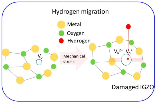 Figure 6a,b compares the subgap DOS extracted from the IGZO TFTs before and after PBS application (stress time: 2000 s) at the flat state and under the mechanical-bending stress, respectively. Figure 6 shows that the subgap DOS near EC increases after PBS application under both mechanical conditions. However, it increases more pronouncely after PBS in the IGZO TFT under mechanical bending stress than that at the flat state. In previous reports, the negative shift of VTH after a long stress time was mainly attributed to the hydrogen diffusion from a low-temperature ALD Al2O3 gate dielectric into an IGZO layer []. As the hydrogen acts as an effective donor in IGZO, it generates the donor states near EC and shifts the VTH of the IGZO TFT in the negative direction. The PBS-induced increase of subgap DOS near EC observed in Figure 6 is possibly ascribed to the increase of the hydrogen concentration inside the IGZO after PBS application. In addition, a more pronounced increase of subgap DOS near EC in the IGZO TFT under mechanical-bending stress is considered as a result of more enhanced hydrogen diffusion from Al2O3 gate dielectric into an IGZO layer in the mechanically stressed IGZO TFT. This result is consistent with that in Figure 4, which shows a more pronounced negative shift of VTH after a long stress time in the mechanically stressed IGZO TFT. More enhanced hydrogen diffusion in the mechanically stressed IGZO TFT is believed to be caused from the increased oxygen vacancies which can act as the hydrogen hopping site in IGZO. Figure 7 displays the schematic diagram illustrating the mechanism responsible for more enhanced hydrogen diffusion form ALD Al2O3 gate dielectric into an IGZO layer in IGZO TFTs under mechanical stress.