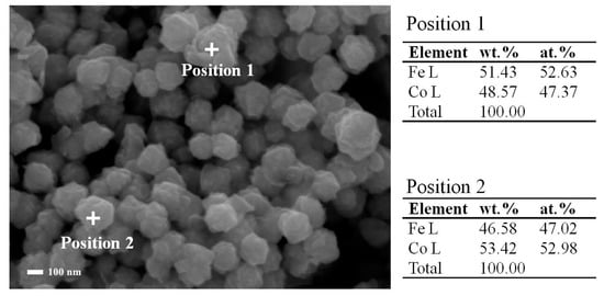 Figure 2 shows the FeCo single-phase solid solution obtained in this work. It can be seen that after the reduction reaction, irregular spheres with a diameter of about 150 nm were formed after the precipitation of Fe2+, Co2+ [,]. The particles were uniform in size, about 100 nm, and uniform in dispersion. Fe2+ and Co2+ were reduced by chemical reaction and finally formed a single-phase solid solution to avoid the easy oxidation of the single metal. Moreover, the surface of FeCo particles was not smooth, which is conducive to the development of back-loaded ZnO as reaction template. The EDS results showed that the irregular sphere was FeCo solid solution because of the more uniform distribution of the two elements, which was further proved by XRD analysis in Figure 3. The diffraction results were only consistent with the diffraction of FeCo solid solution in sample A of FeCo solid solution material.