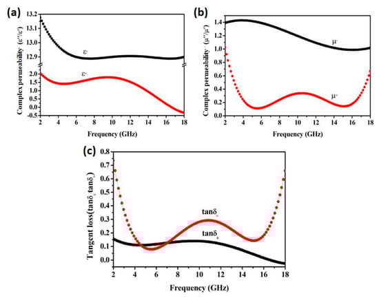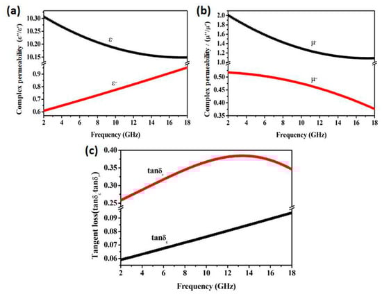 Figure 7 shows the dielectric constant and permeability of FeCo/ZnO composites. The changing trends of value ε’ and ε” are shown in Figure 7a. Unlike the FeCo single-phase solid solution, FeCo/ZnO composites had a higher dielectric constant and better dielectric loss ability. Their value μ’ exhibited a general downward trend in the range of 2–18 GHz in Figure 7b, while the curve of μ” had two troughs, with minimum values at 3 GHz and 15 GHz, and a maximum value at 10.5 GHz. Further analysis showed that the changing trend of the dielectric loss tangent (tanδε = ε″/ε′) of FeCo/ZnO composites was gentle and decreased gradually as the frequency increased, as shown in Figure 7c. While the variation trend of the magnetic loss tangent (tanδμ = μ″/μ′) was the same, the fluctuation was relatively large. Moreover, the dielectric loss between 4.7 GHz and 6.3 GHz was less than the tangent value of dielectric loss, indicating that in this frequency range the dielectric loss was the main type of absorption and in other frequencies it was the magnetic loss. This multiple loss mechanism is conducive to the improvement of the absorbing properties of composite materials [].