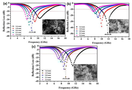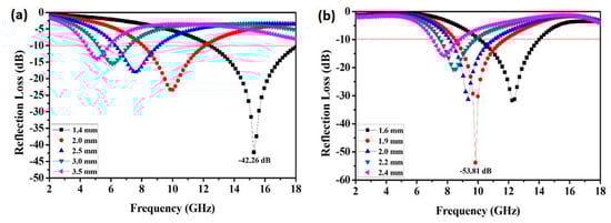 Figure 5b shows the reflective loss (RL) of the prepared FeCo/ZnO composite under different matching thickness. The effective absorbing frequency gradually moved to a lower frequency with the matching thickness increasing. In particular, the optimal reflection loss (RL) value can reach −53.81 dB at 9.8 GHz at 180 °C and effective bandwidth (RL< −10 dB) is 3.8 GHz in the frequency range of 8.7–11.8 GHz with a matching thickness of 1.9 mm. The above results were obviously better than those reported at present [,].
