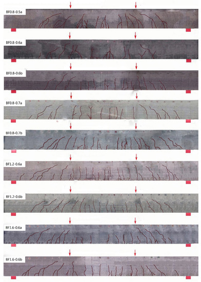 In case of the same SFRELC depth ratio αh = 0.6, the crush of conventional concrete almost with the simultaneous fracture of the rebar occurred on test beams BF0.8-0.6a/b with vf = 0.8% and BF1.2-0.6a/b with vf = 1.2%, while the crush of conventional concrete only took place on test beams BF1.6-0.6a/b with vf = 1.6%. This confirms that the presence of steel fibers in the tension zone of the test beams would not only improve the toughness of failure but also change the failure pattern [16,22]. An obvious phenomenon of more main cracks with shorter extension was observed in BF1.6-0.6b. This is beneficial to the redistribution of tensile force along the span into several main crack sections and the assistance of steel fibers bearing tensile force at the cross-section, and finally contributes to the increase of fatigue lift due to the reduction of tensile stress of the longitudinal tensile rebars.
