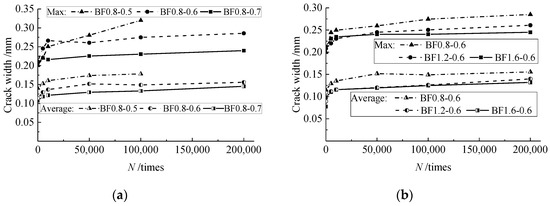Figure 3 presents the crack distribution of test beams before fatigue failure. The main cracks at pure bending sections almost appeared during the procedure of static loading before fatigue. Combined with the changes of the maximum and average crack width presented in Figure 4, the cracks elongated and opened rapidly under the fatigue within 5000 numbers. After that, the development of cracks became steady with some root cracks at the bottom of the test beams.