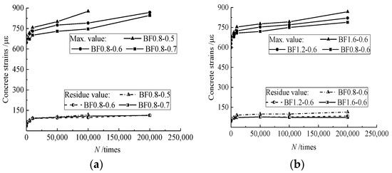 Under the fatigue load, the total strain of the material increases with the fatigue life in three stages: the first stage is about 5%–10% fatigue life, the strain grows rapidly due to the inherent flaw initiation, such as the presence of air voids and weak regions between aggregates and binder paste; the second stage is about 80% fatigue life, the strain increases slowly and steadily due to the steady development of internal damage; the third stage is about 5%–10% fatigue life, the strain increases fast due to the unstable development of internal damage over a critical limit [37,40,49,50]. In this study, as presented in Figure 6, the increase of concrete strain in the top surface of the compressive zone of the test beams had similar trends as mentioned above in the first two stages with cyclic numbers, while the third stage was not measured due to the defect of measures. During these states, the strain development in the compression zone of the superposed beam did not change with the presence of steel fibers in the tension zone.