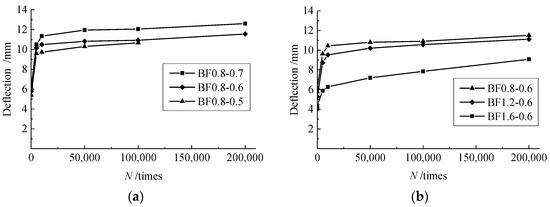 The mid-span deflection is a macro index reflecting the sectional deformation of test beams. Similar to the changes in the compressive strain of concrete, as presented in Figure 7, the mid-span deflection of test beams passed through the same stages under the fatigue load. Due to the decrease of the flexural stiffness of the test beams with the increase of αh [24,25], the mid-span deflection of the test beams increased with αh in the case of the same vf. Meanwhile, in the case of the same αh, the confinement of steel fibers to cracks enhanced the integrality of the test beam and benefited the flexural stiffness. This led to a reduction in the mid-span deflection of the test beams with the increasing volume fraction of steel fiber vf.