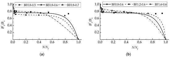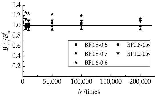 Figure 10 exhibits the trend curves of degenerated flexural stiffness of test beams, where the relative stiffness is the ratio of the stiffness at a cyclic number to the initial stiffness, and the relative life is the ratio N/Nf of a cyclic number to fatigue life.