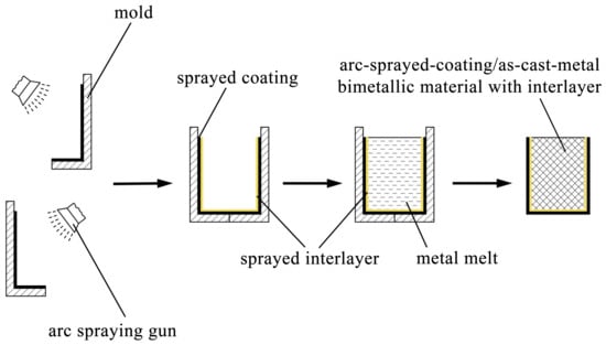 The AZ91D ingots were placed in steel crucibles, and they were heated and melted in an electrical resistance furnace. During the fusion process, the AZ91D melt was covered by some RJ-2 flux to prevent the magnesium alloy from being oxidized and combusted. The molds deposited with Al/Zn double-deck coating were taken out from the furnace after a specific period of preheat treatment, and next the AZ91D melt was poured into the molds at 993 K. A few hours later, the magnesium alloys were completely solidified and cooled down, and the arc-sprayed Al/AZ91D bimetals with a Zn interlayer were finally acquired after the molds were removed. The whole process of the outer cladding by SLCC with a metallic interlayer is illustrated in Figure 1.