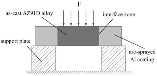 Metallographic samples were taken from the arc-sprayed Al/AZ91D bimetals by using an electrical discharge machine (EDM) to investigate the interfacial microstructure. The metallographic samples were grounded and polished with silicon carbide paper and diamond pastes, and they were etched by a solution of 3% concentrated nitric acid (HNO3) and 97% (vol.%) ethyl alcohol. The interfacial microstructures and fracture surfaces of the arc-sprayed Al/AZ91D bimetals with a Zn interlayer were observed by using a TESCAN VEGA III LMH scanning electron microscope (SEM, TESCAN, BrNo, South Moravia, Czech Republic) equipped with an energy dispersive X-ray spectroscope (EDS, Oxford instruments, Oxford, UK). The phase constitutions of the interface zone were detected by a D/max 2500PC X-ray diffraction (XRD, Rigaku, Tokyo, Japan). The Vickers microhardness across the interface of the arc-sprayed Al/AZ91D bimetals with a Zn interlayer was measured by a Struers Duramin-5 Microhardness Tester (Struers Inc., Cleveland, OH, USA) with a load of 100 g and a holding time of 10 s. From the AZ91D matrix to the Al coating, the indentations were arranged in a line across the whole interface zone, and suitable distances between the adjacent indentations were reserved to reduce the interference. The push out tests were conducted to determine the shear strength of the arc-sprayed Al/AZ91D bimetals with a Zn interlayer, which could represent the bonding strength between AZ91D and the Al coating. The samples for the push out tests were machined as rectangular solids, and the dimensions of them were 12 × 12 × 35 mm. The central regions of the samples were pushed by a steel punch at a displacement rate of 0.5 mm/min, and the main microstructure of the loading regions was the as-cast AZ91D alloy. The relationship curves between the shear stress and deformation displacement could be obtained, and the shear strengths of the arc-sprayed Al/AZ91D bimetals with a Zn interlayer could be also calculated using the following equation:
