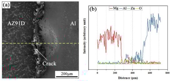 The relative content of aluminum was at a high level, and zinc can dissolve in α-Al phase at a high solubility. With the increase of the distance from the Al coating, the relative content of aluminum gradually reduced, while the relative content of zinc augmented. The α-Al solid solution and MgZn2 intermetallic compound would form in accordance with the following reaction [17,19]: