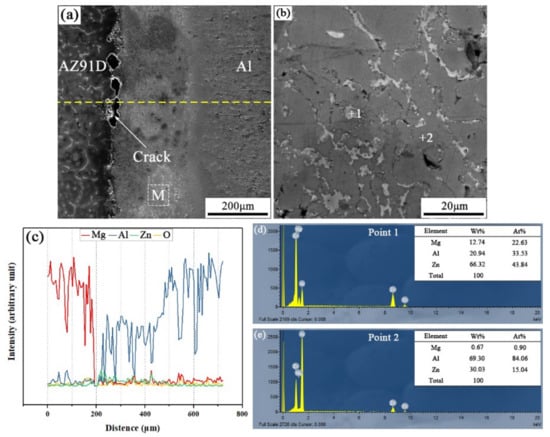 When the arc-spraying time of the Zn coating was 10 s and the preheat time of the Al/Zn coating was 12 h (S10H12), the thickness of the interface zone in the arc-sprayed Al/AZ91D bimetals with a Zn interlayer was about 265 μm. As the preheat time of the Al/Zn coating was increased to 12 h, the Al element had more time to diffuse into the Zn coating, forming the Al or Zn solid solution. The SEM micrographs of the S10H12 sample and the corresponding EDS line scan spectrum (Figure 4) reveal that there was a homogeneous layer with a high content of aluminum at the interface zone, accompanied by some cracks and pores. The EDS point scan spectra of points “1” and “2” (marked in Figure 4b) are displayed in Figure 4d,e, and the interface zone between the AZ91D matrix and the Al coating was mainly composed of Al solid solution and Mg32(Al, Zn)49 intermetallic compound. In addition, the contents of aluminum and zinc were slightly more than that of magnesium within the interface. According to the Al–Mg–Zn ternary system, the α-Al and Mg32(Al, Zn)49 were formed through the following reaction [16]: