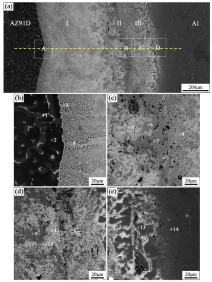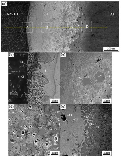 SEM micrographs of the interface in arc-sprayed Al/AZ91D with a Zn interlayer (arc-spraying Zn for 18 s and Al/Zn double-deck coating preheated for 12 h): (a) general view, (b–e) areas A, B, C, and D in (a), respectively.