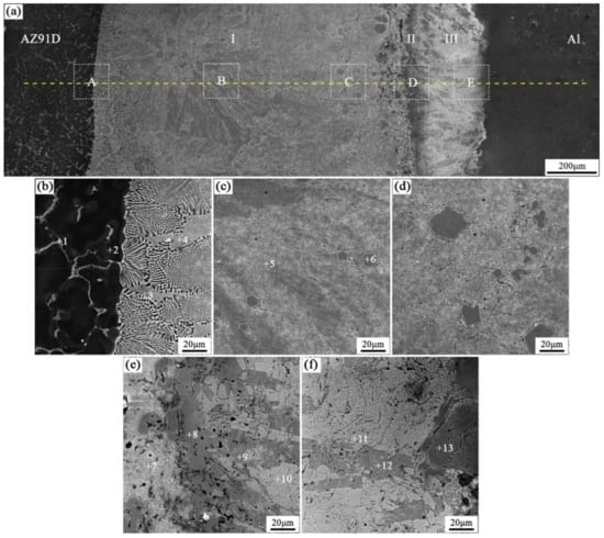 SEM micrographs of the interface in arc-sprayed Al/AZ91D with a Zn interlayer (arc-spraying Zn for 30 s and Al/Zn double-deck coating preheated for 12 h): (a) general view, (b–f) areas A, B, C, D, and E in (a), respectively.