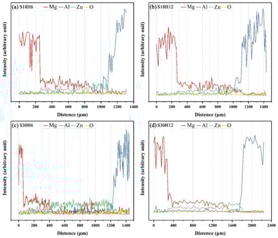 When the arc-spraying time of the Zn coating was 18 s, and the preheat time of the Al/Zn coating was 6 h (S18H6), the thickness of the interface zone in the arc-sprayed Al/AZ91D bimetals with a Zn interlayer was about 912 μm. As can be seen in Figure 5a, the microstructure of the interface zone can be divided into three different layers (I, II, and III) without obvious cracks or pores. Through a comprehensive analysis of the EDS results (Table 4 and Figure 9a) and XRD results (Figure 10a), the major constituents of layer I adjacent to the AZ91D matrix were α-Mg solid solution and Al5Mg11Zn4 intermetallic compound, and layer III adjacent to the Al coating was mainly composed of α-Al solid solution and Mg32(Al, Zn)49 intermetallic compound—while layer II between layer I and III contained β-Zn solid solution, and Al5Mg11Zn4 and MgZn2 compounds. The diffusion of Al element from the Al coating to the Zn coating was insufficient due to the limited preheat time, so the Zn coating could not completely transform into Al–Zn coating. Although the Mg atoms in the AZ91D melt had a stronger diffusion ability than Al atoms in the Al coating, the Mg atoms were inadequate to combine with all Zn atoms, leaving behind some β-Zn solid solutions in layer II (as presented in Figure 5c).