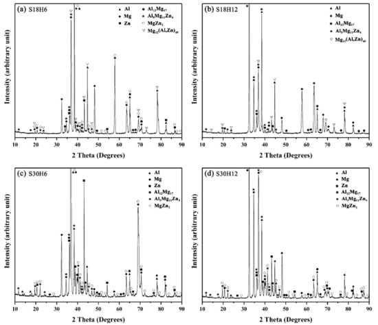XRD pattern of the constituent phases at the interface of the arc-sprayed Al/AZ91D with a Zn interlayer: (a) S18H6, (b) S18H12, (c) S30H6, and (d) S30H12.