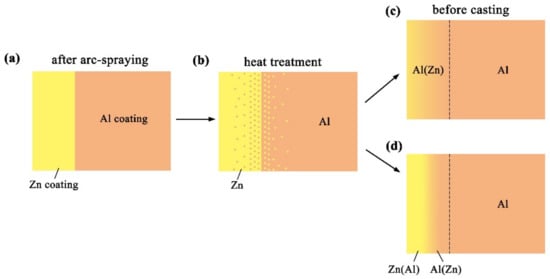 Schematic illustrations of the interface formation process in arc-sprayed Al/AZ91D with a Zn interlayer: Partial Al/Zn double-deck coating transformed into xAl-(1 − x)Zn coating (x > 50%).