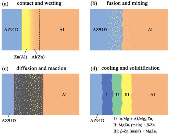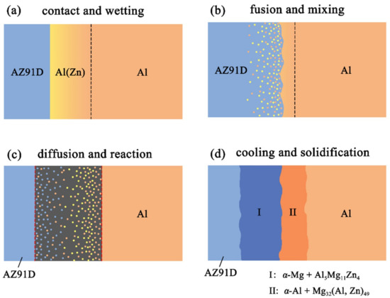 Schematic illustrations of the interface formation process in arc-sprayed Al/AZ91D with a Zn interlayer: The whole Al/Zn double-deck coating transformed into xAl-(1 − x)Zn coating (x > 50%).