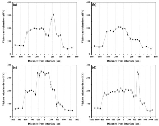 Vickers microhardness profiles across the interfaces of arc-sprayed Al/AZ91D with a Zn interlayer: (a) S18H6, (b) S18H12, (c) S30H6, and (d) S30H12.