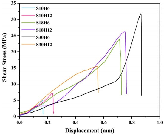 In this study, the shear strength was used to evaluate the bonding strength between the arc-sprayed Al coating and the AZ91D matrix. Figure 15 displays the relationship curves between the shear stress and deformation displacement arc-sprayed Al/AZ91D bimetals with a Zn interlayer under different arc-spraying times of the Zn coating (18 and 30 s) and various preheat times of the Al/Zn double-deck coating (6 and 12 h).
