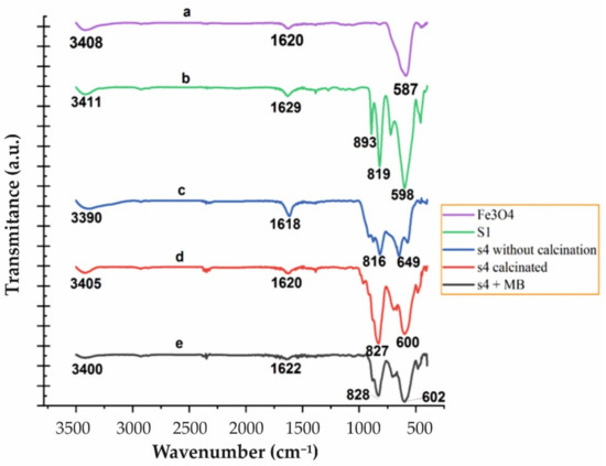 To identify the functional groups and oxide metal bonding in Fe3O4, Fe3O4/CdWO4 (sample S1) and Fe3O4/CdWO4/PrVO4 (sample S4) before and after the calcination process, and after photocatalysis in the presence of the MB dye, Fourier transformation infrared (FT-IR) spectroscopy was used; the results are presented in Figure 4. The FT-IR spectra were recorded between the 450 cm−1 and 3500 cm−1 wavelengths at room temperature.