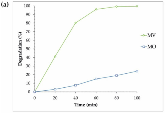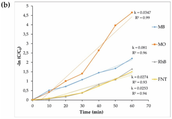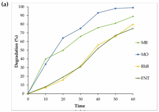 Similar experiments on the photodegradation of MV and MO were performed with the same sample (S4), and the results are displayed in Figure 6. Some additional photocatalytic degradation tests were carried out using MB, MO, FNT, and RhB pollutants to gain a better understanding of the S4 properties under an ultraviolet wavelength, and the results are shown in Figure 7. Therefore, the reduced size of sample S4 led to an increase in the surface of the nanoparticles as well as more absorption under ultraviolet rays, improving the production of the radical species and resulting in the enhancement of the degradation of dyes.