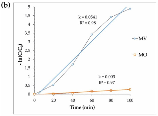 (a) The photocatalytic degradation of the MV and MO pollutants by the S4 sample under visible light assisted by H2O2, and (b) the pseudo-first-order kinetics of the MV and MO degradation by S4.