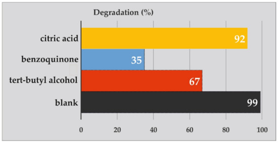 The outcomes of applying these scavengers for the photodegradation of MB (25 ppm) are represented in Figure 8. The addition of a superoxide scavenger to the studied solution could lead to a reduction of the photocatalytic performance of inorganic nanoparticles by up to two thirds. Interestingly, the addition of a hydroxyl scavenger resulted in a noticeable decrease in the photocatalytic performance (less than half). However, the addition of a holes scavenger had an insubstantial influence on the photocatalytic activity of the inorganic nanoparticles.