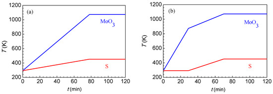 To reduce the formation of intermediate products, it is necessary to reduce the chance for MoO3(g) to contact with S2(g) at low temperatures. To achieve this purpose, a two-step heating method, as shown in Figure 2b, was employed. First, the MoO3 zone was rapidly heated to 837 K at a rate of 20 K/min, and then slowly heated to 1098 K at a rate of 5 K/min. The heating of the S zone began at the time when the temperature of the MoO3 zone was heated to 837 K, which can prevent the formation of MoO2, since there is no chance for MoO3(g) and S2(g) to contact at a temperature lower than 837 K.