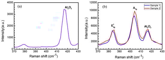 Based on the Raman scattering effect, Raman spectroscopy can be used to study the structure of molecules by analyzing the scattering spectrum different from the incident light frequency. There are five vibration modes (g, g, E1g, E1u, and A1g) in MoS2. For the Raman spectroscopy test of MoS2, only g and A1g modes are observed [22,23]. The characteristic peak position of the Raman spectrum of MoS2 is related to the film thickness. The Van der Waals force increases as the layer number decreases. When the layer number of the film decreases gradually, the characteristic peak corresponding to the A1g vibration mode happens to red shift (shifts to the long wavelength side), and the characteristic peak corresponding to the g vibration mode happens to blue shift (shifts towards the blue end of the spectrum). When MoS2 is a bulk material, the g peak is located near 382 cm−1, and the A1g peak is located near 407 cm−1. When the layer number of MoS2 is reduced to a single layer, the g peak shifts towards the blue end, to approximately 385 cm−1, and the A1g peak shifts to the long wavelength side, to approximately 403 cm−1. The A1g peak corresponding to MoS2 film of different layers differs from the g peak, and thus the layer number of MoS2 could be determined based on the difference between the detected A1g peak and g peak [24]. Figure 7 shows the results of the clean sapphire substrate and the single-layer triangular MoS2 samples deposited on the substrate obtained by Raman spectroscopy. By comparing Figure 7a,b, it can be inferred that the peak appearing at a wavenumber of 416 cm−1 in Figure 7b is caused by the influence of the sapphire substrate Al2O3. The temperature in the high temperature zone of sample 1 (the sample in Figure 5b) is 1073 K, and the temperature in the high temperature zone of the sample 2 (the sample in Figure 5c) is 1098 K. It can be seen that the g peak of the single-layer triangular MoS2 in the two samples is approximately 385 cm−1, and the A1g peak is approximately 403 cm−1. The wavenumber difference is 19.2 cm−1 and 20.7 cm−1, respectively. This indicates that the deposits on the sapphire substrate of sample 1 and sample 2 are single-layer MoS2, which is consistent with the predicted results of SEM.