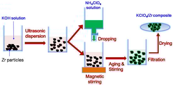The schematic diagram illustrating preparation process was presented in Figure 1. NH4ClO4 and KOH were of analytical grade and used without treatment. Three kinds of micrometer Zr powders with averaged particle sizes of 3 μm (Shanghai St-Nano Science and Technology Co., Ltd., Shanghai, China), 6 μm (Jinzhou Institute of Metal Material, Jinzhou, China) and mesh 400 (General Research Institute for Nonferrous Metals, Beijing, China) were used, respectively. In a representative experiment, 0.8 g KOH and 0.8 g Zr powder were added into 30 mL de-ionized water, and the suspension was ultrasonically oscillated for 15 min to break the conglomeration of Zr particles. Then the suspension was magnetically stirred to avoid sedimentation of Zr particles. 1.2 g NH4ClO4 was dissolved into 20 mL de-ionized water, and the obtained NH4ClO4 solution was dropped into the aforementioned suspension by an injection pump with a rate of <0.4 mL/min. During dropping, the suspension was stirred at the rate of >550 r/min. After dropping, the suspension was stirred for another 60 min with the same stirring rate. Finally, particles in the suspension were separated out through vacuum filtration and dried at 60 °C in a vacuum oven. The averaged pore size of the filter paper was 1~3 μm. All the manipulations were carried out under room temperature. The room temperature in this study was controlled to be 21 °C with an air conditioner. The mass ratio of KClO4 to Zr can be easily adjusted by changing the usage of Zr powders, concentration of reactants solution, reaction time and temperature.