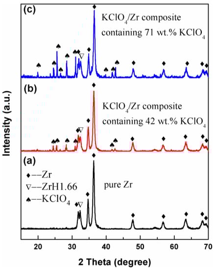 XRD patterns of (a) pure Zr (3 μm), (b) KClO4/Zr (3 μm) composite containing 42 wt.% KClO4 and (c) KClO4/Zr (3 μm) composite containing 71 wt.% KClO4.