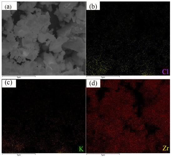 SEM image (a) and EDS mapping of Cl (b), K(c) and Zr (d) elements for KClO4/Zr (3 μm) (38/62, wt.%) composite.
