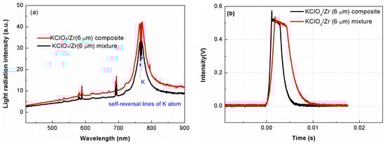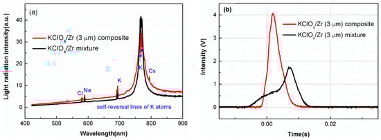 The spectra in Figure 6a were dominated by the continuous background, over which were superposed some selective emission bands of neutral K, Cl, and impurities of Na and Cs []. It was seen from Figure 6a that light-radiation intensities at almost all wavelengths except the local intensity decrease around 766 nm for the KClO4/Zr composite sample were stronger than that of the mechanical mixture. This local intensity decrease around 766 nm was originated from the self-reversal of K atoms in the combusting flame. The self-reversal behavior may fluctuate depending on several complex factors such as the K atoms concentration and temperature gradient of flame, but it did not influence the increasing trend of total light-radiation energy within the whole wavelengths. The total light-radiation energy could be relatively compared by the integrated area of the spectra curves in the wavelength range of 420~900 nm. The calculated value of integrated area for KClO4/Zr composite was 32% larger than that of mechanical mixture (3145 vs. 2375), indicating higher light-radiation energy. Figure 6b revealed that the peak intensity of light-emission trace for KClO4/Zr composite was more than two times of its counterpart, indicating higher peak light-radiation power.