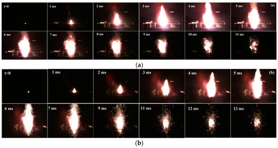 Flame sequence of combusting KClO4/Zr (6 μm) composite (a) and KClO4/Zr (6 μm) mechanical mixture (b).