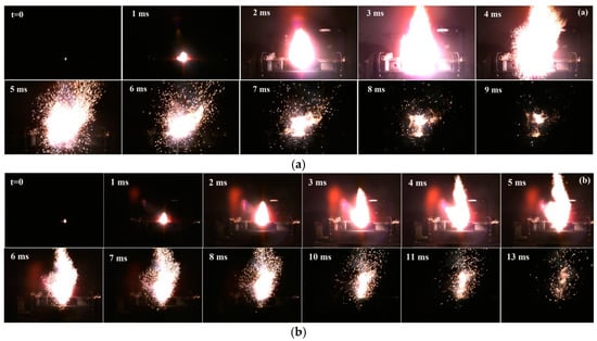 Figure 8 and Figure 9 showed the flame sequences of KClO4/Zr (3 μm) composite, KClO4/Zr (6 μm) composite and corresponding KClO4/Zr mechanical mixtures. It was necessary to point out those images for composite samples in Figure 8b and Figure 9b were captured from a farther distance than the corresponding mechanical mixture samples in Figure 8a and Figure 9a, because the surface areas of flames were too larger than the field view of camera. Thus, these images were only used to qualitatively compare their combustion and light-radiation variation characteristics with the reference samples, trying to find clues on different reaction mechanisms.