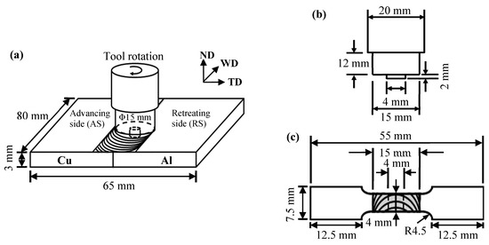 - Zhang, W.; Shen, Y.; Yan, Y.; Guo, R. Dissimilar friction stir welding of 6061 Al to T2 pure Cu adopting tooth-shaped joint configuration: Microstructure and mechanical properties. Mater. Sci. Eng. A 2017, 690, 355–364. [Google Scholar] [CrossRef]