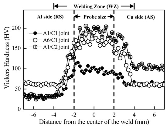 3.1. Microstructures and Microhardness Variation of FSW Al–Cu Dissimilar Joints
