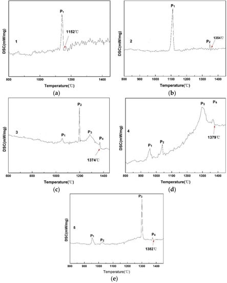 DSC results of the non-isothermal crystallization process of the CaO-SiO2 mold fluxes with increasing Al2O3/SiO2 ratio. (a) Al2O3/SiO2 = 0.088; (b) Al2O3/SiO2 = 0.151; (c) Al2O3/SiO2 = 0.261; (d) Al2O3/SiO2 = 0.367; (e) Al2O3/SiO2 = 0.562.