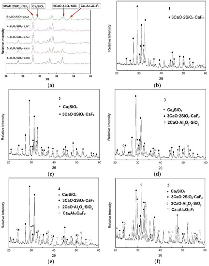 Phase identified by XRD for the CaO-SiO2-based mold flux. (a) The overall comparison diagram; (b) Al2O3/SiO2 = 0.088; (c) Al2O3/SiO2 = 0.151; (d) Al2O3/SiO2 = 0.261; (e) Al2O3/SiO2 = 0.367; (f) Al2O3/SiO2 = 0.562.