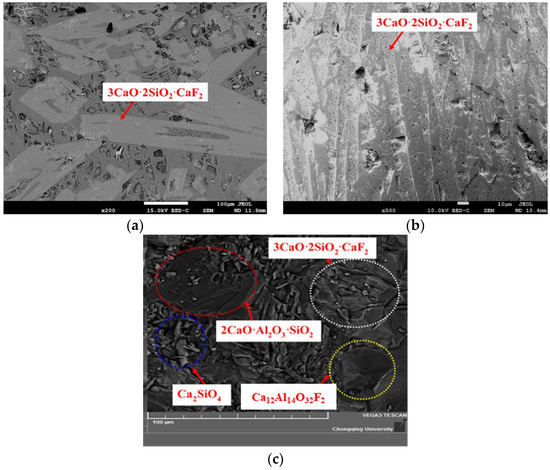 Block samples were taken for SEM-EDS analysis to determine the phase and crystal morphology. The mold fluxes appeared severely pulverized with the increase in the Al2O3 content. When Al2O3/SiO2 ratio increases to 0.261, no block can be formed. Therefore, Samples 1 and 2 were observed by SEM-EDS to identify the phase and crystal morphology. Powder sample No. 5 was also analyzed by SEM-EDS to identify the phase. The results are shown in Figure 5a–c; it can be observed that cuspidine (Ca4Si2O7F2) has a lath-like or faceted morphology in Samples 1 and 2, and in Sample 2, Ca2SiO4 could not be found, perhaps due to the small size and low amount. Guo et al. [14] reported that cuspidine presents the same morphology as in traditional CaO-SiO2 mold flux. Four types of crystalline phases are identified in the SEM of Sample 5, which is consistent with the XRD results.