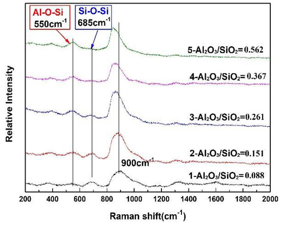 Raman spectra for glassy samples with different Al2O3/SiO2 ratios.