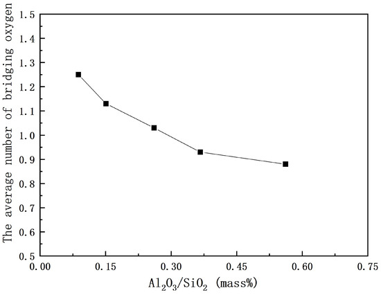 The proportion of each structure unit can be evaluated by the corresponding integrated areas [4]. Detailed quantitative deconvolution of Raman bands is listed in Table 2. Q0 increases with increasing Al2O3/SiO2 ratio, but Q1, Q2 and Q3 slightly decrease. This means that the higher number of bridge oxygen structure units decreases during the process, indicating that the polymerization degree of the network is reduced. In the present work, the average number of bridging oxygens of each sample (Ni, which can be estimated by the area ratio of each structural units (Qn, n = 0, 1, 2, 3) multiplied by the number of its bridging oxygen, i is the sample number) is used to explain the change of the silicate structural network shown in Figure 8 [4]. It can be observed that the average number of bridging oxygens decreases from 1.25 to 0.88, which may be caused by the decrease of the total molar content of Al2O3 and SiO2.