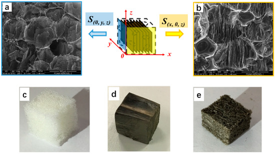 Figure 2 shows schematic illustration of the resulting aerogel/PUF composite with 3D coordinates. Comparing the coordinates established in Figure 1, the coordinates were rotated to show the S (x, 0, z) and S (0, y, z) surfaces. The parallel lamellas structure of the aerogel/PUF composite can be clearly seen when the composite was observed from S (x, 0, z) surface, Figure 2b; while, the flat wall structure was obtained when the S (0, y, z) surface was observed, Figure 2a. The photographs of pristine PUF, the outside surface and the cross section of the aerogel/foam composite are presented in Figure 2c–e, correspondently.