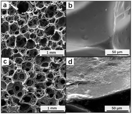 SEM images to show the porous structure of the (a) pristine PUF and (c) rGO coated PUF. High magnification SEM images to show the (b) smooth surface of the pristine PUF and (d) rough rGO coating layer on the surface of rGO coated PUF.