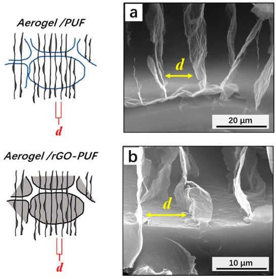 SEM images to show the aligned lamellas structure of the aerogel and the bonding interface of the (a) aerogel/PUF composite and (b) aerogel/rGO-PUF composite.