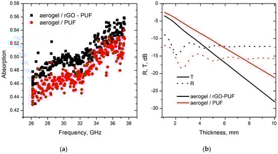 The absorption spectra of loaded foams are demonstrated in Figure 6a for 2.3 mm thick layer of aerogel/PUF samples. Both aerogel/PUF and aerogel/rGO-PUF show high absorption ability (up to 56% of initial radiation), having extremely low density (0.065 g/cm3 and 0.066 g/cm3 for Aerogel/PUF and Aerogel/rGO-PU correspondently). This means that both samples are really perspective candidates for producing lightweight electromagnetic absorbers for microwaves, in favor of aerogel/rGO-PUF.