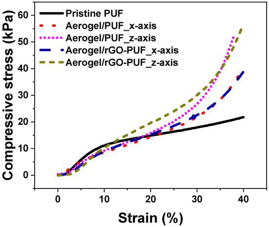 The mechanical strength of rGO/CS aerogels prepared by freeze-drying methods is generally poor. The PUF plays the role of elastic scaffold to enhance the strength of the aerogel/PUF composites. Figure 8 shows that mechanical strength of both aerogel/PUF and aerogel/rGO-PUF composites is higher than that of pristine PUF. For instance, the compressive strength of the pristine PUF at 40% strain is 21.8 kPa while the strengths of the aerogel/PUF and aerogel/rGO-PUF composites compressive in x-axis at same strain are 40.3 and 38.9 kPa, respectively. As anisotropic materials, the composites possessed higher strength in the z-axis, which are 52.8 and 56.6 kPa for aerogel/PUF and aerogel/rGO-PUF composites at 40% strain, respectively. The aligned lamellas structure in the z-axis, Figure 2b, provide higher compression resistance than the parallel lamellas in the x-axis. Compared to the aerogel/PUF composites, the rGO coating layer did not show obvious influence on the mechanical properties of the aerogel/rGO-PUF composites.