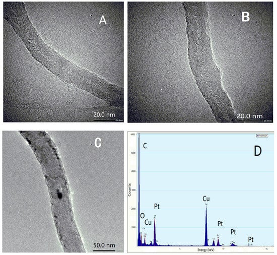 In this study, the morphological characterizations of MWCNTs, BLG-MWCNTs, and BLG-MWCNTs-PtNPs were revealed by TEM and are shown in Figure 1. In order to determine the structure of composite materials, TEM examinations were conducted at different levels of magnification. Figure 1 shows the microstructures of MWCNTs (Figure 1A) and BLG-MWCNTs (Figure 1B). It is known that MWCNTs generally consist of several graphite layers of different diameter, like coaxial cables. There are two disulfide bonds and one free sulfhydryl group in the structure of a BLG, which improves the dispersibility of composite materials. Taking advantage of abundant amino acids from BLG-MWCNTs, it is easier for Pt nanoparticles to anchor to active sites. Figure 1C shows the result of the synthetic nanocomposite. PtNPs are dispersed on the surface of the BLG-MWCNTs without accumulation and agglomeration. We also analyzed the EDX spectra of BLG-MWCNTs-PtNPs (Figure 1D). EDX analysis revealed that the nanocomposite consisted of C, O, Cu, and Pt elements. Cu and O peaks were from the substrate. In conclusion the BLG-MWCNTs-PtNPs nanocomposite was synthesized successfully.