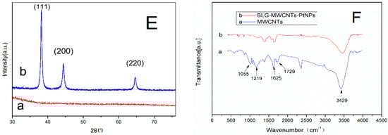 TEM results of MWCNTs (A), BLG-MWCNTs (B), and BLG-MWCNTs-PtNPs (C); EDX spectrum (D) of BLG-MWCNTs-PtNPs nanocomposite; XRD result of BLG-MWCNTs-PtNPs (b) and MWCNTs (a) (E); FT-IR result of BLG-MWCNTs-PtNPs (b) and MWCNTs (a) (F).