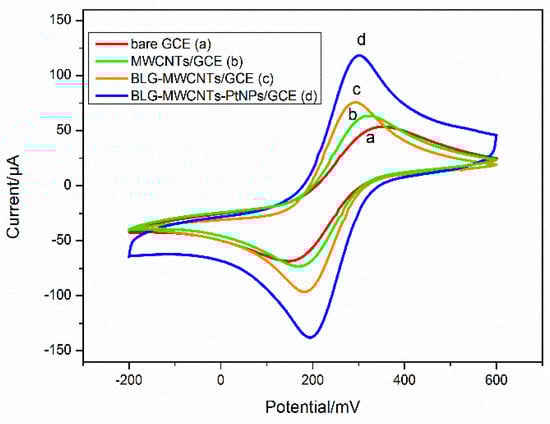 Cyclic voltammograms (CVs) of GC electrode (a), MWCNTs modified GC electrode (b), BLG-MWCNTs modified GC electrode (c) and BLG-MWCNTs-PtNPs modified GC electrode (d) scanned in 0.1 M KCl solution with 10 mM [Fe(CN)6]3−.