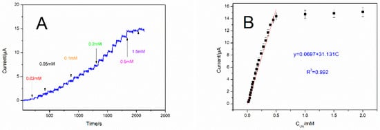Figure 4A shows the amperometric response after continuous progressive addition of uric acid with UOx/BSA/BLG-MWCNTs-PtNPs/GCE (0.1 M PBS, pH 7.0) at working potential 0.4 V. The UA biosensor could reach 95% of the maximum current within 5 s, indicating that it had a rapid response to uric acid. Through the calibration curve of the UA biosensor displayed in Figure 4B, we see that UA concentration had a linear relationship with current response from 0.02 to 0.5 mM. The result can be summarized as y = 0.0697 + 31.131C (R2 = 0.992). In this linear regression, y represents the measured current value and the concentration of UA is indicated as C. Sensitivity is calculated to be 31.131 μA mM−1. According to the definition from International Union of Pure and Applied Chemistry (IUPAC), a signal is considered to be credible when the signal-to-noise ratio is equal to 3 []. Based on this theory, the detection limit of the UA biosensor was 0.8 μΜ (S/N = 3).